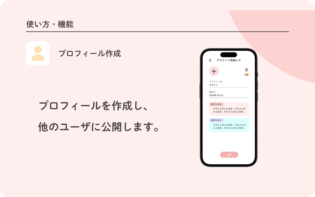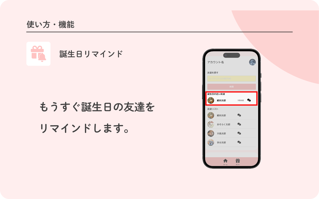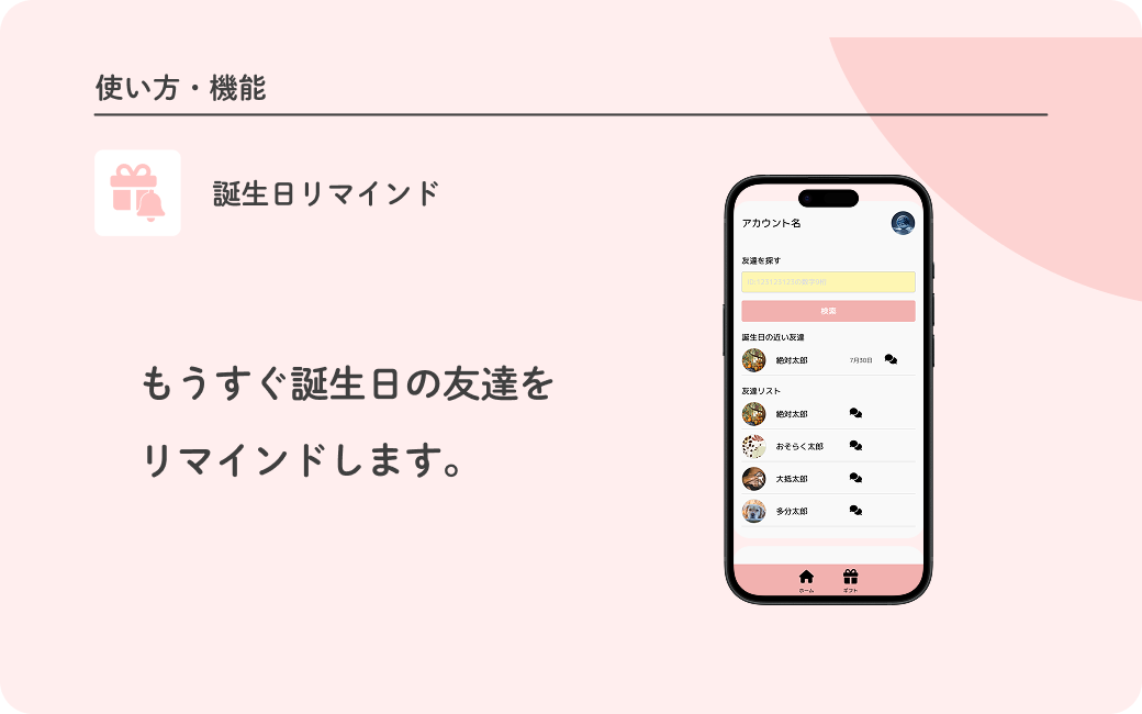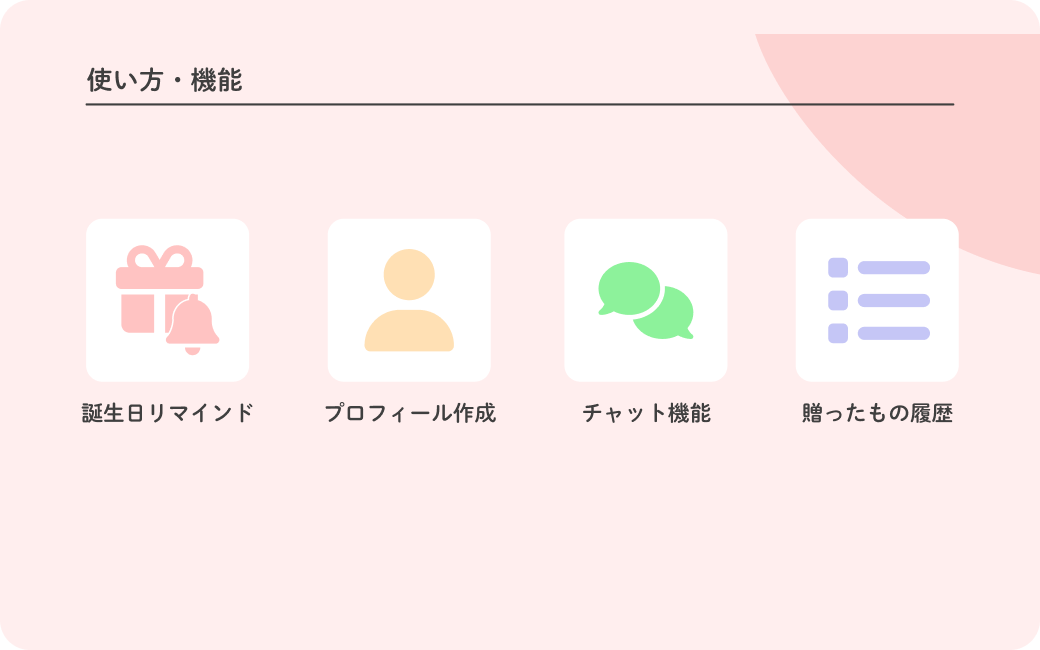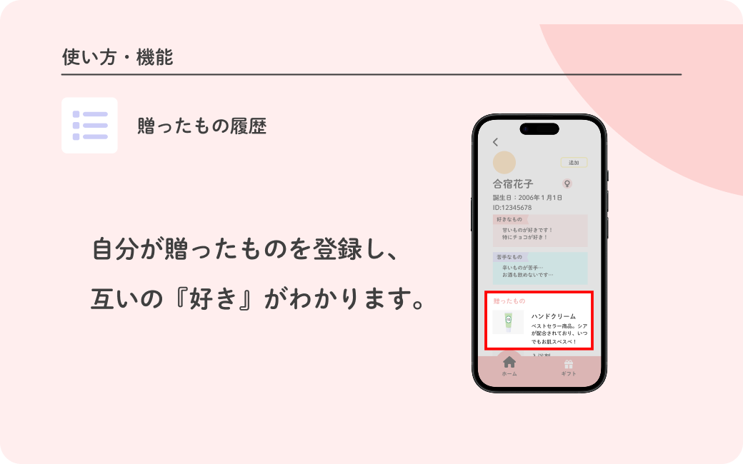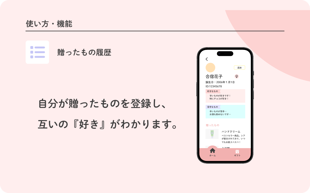 ユーザがアプリに登録した「好きなもの」「苦手なもの」から相手がどんなものを贈られて嬉しいのかを知ることができます。